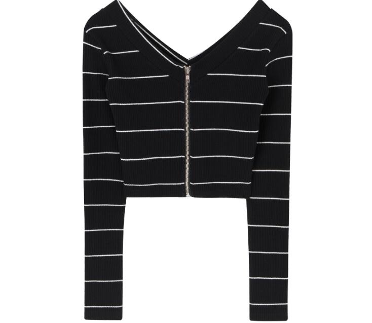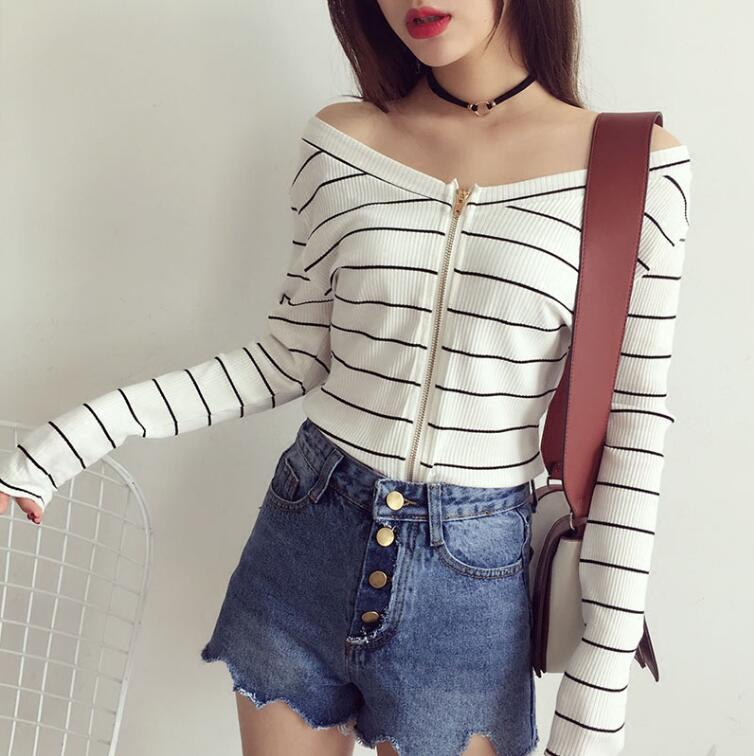 Fashion & Sexy off shoulder long sleeve stripes T-shirts with zipper.