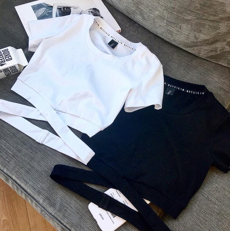 Fashion & Sexy cross strap solid short sleeve crop top.