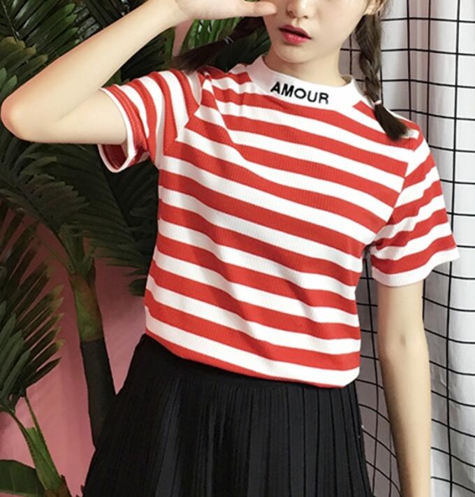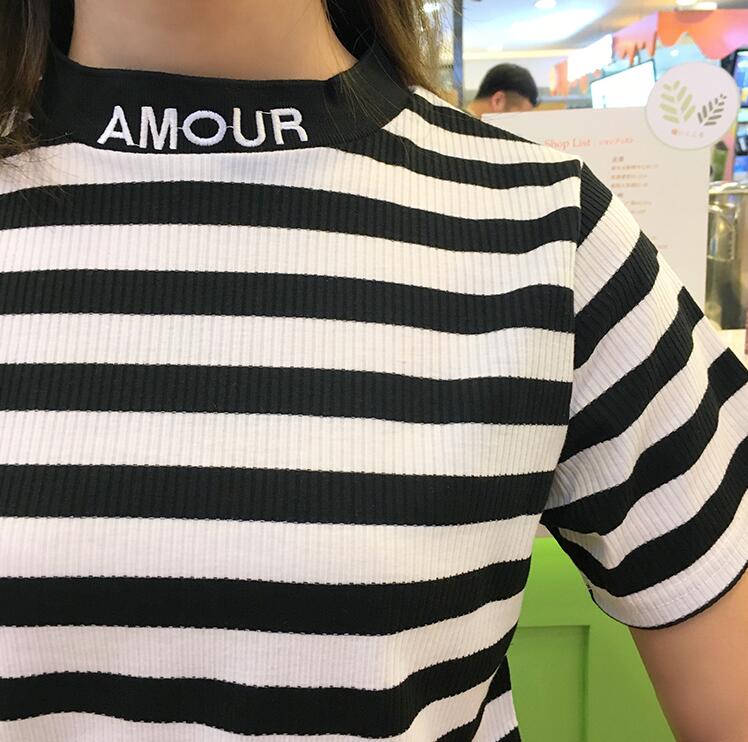 Fashion & Harajuku AMOUR high neck slim striped T-shirt.