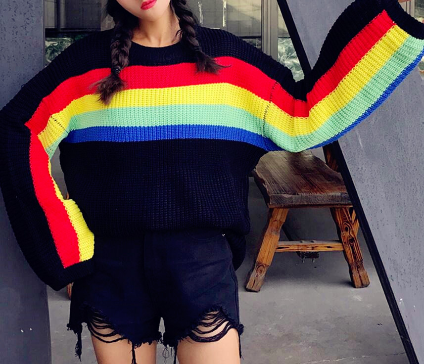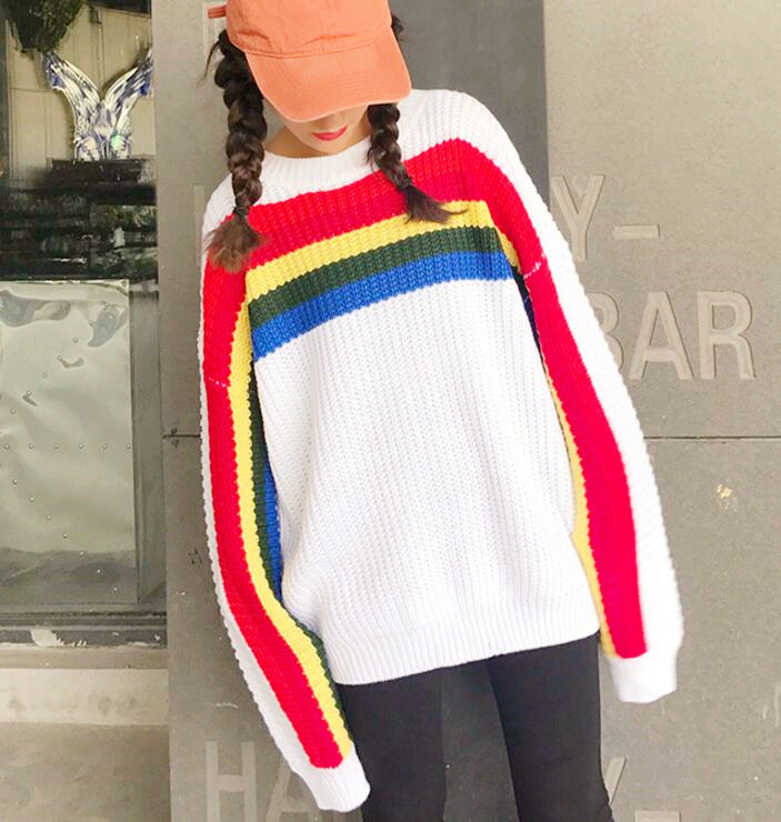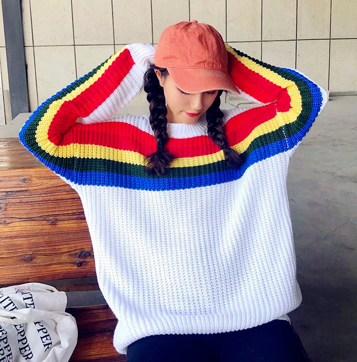 Fashion & Harajuku O-neck loose rainbow stripe sweater.