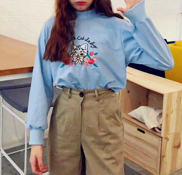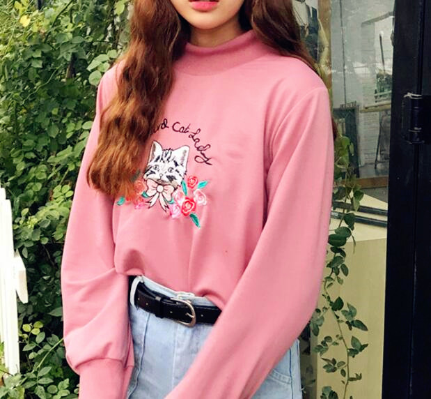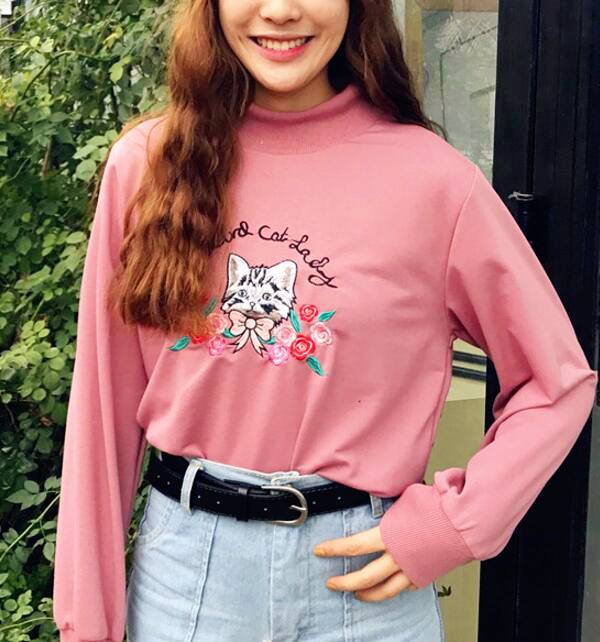Fashion & Harajuku cat flower embroidered sweatshirt.