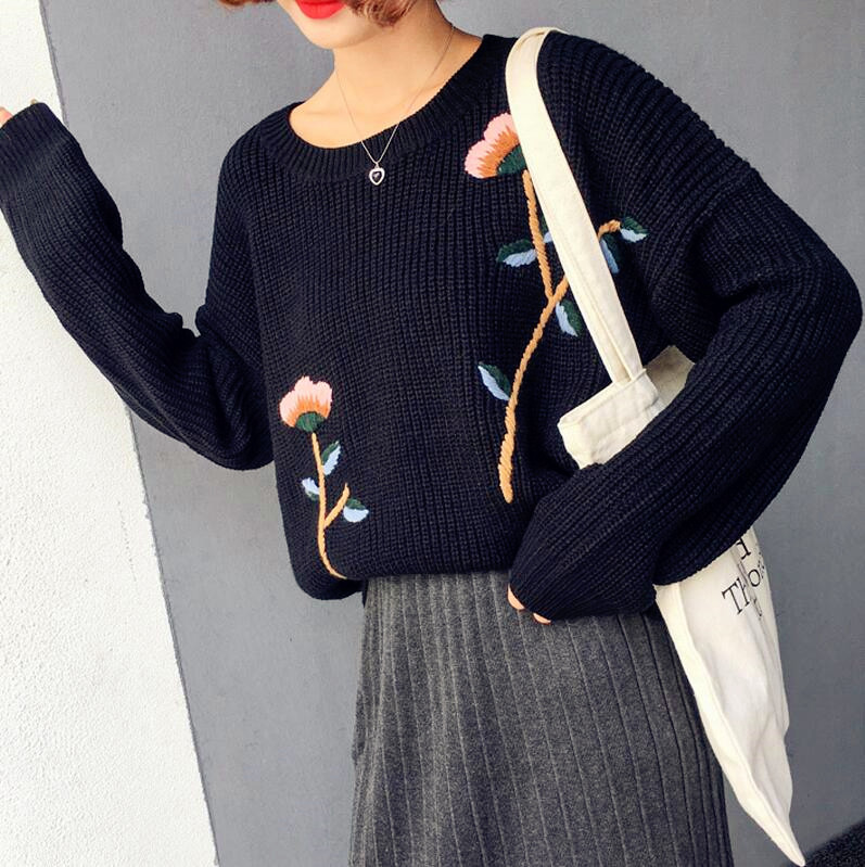 Retro Flower Embroidered Wavy Edge Knit Sweater