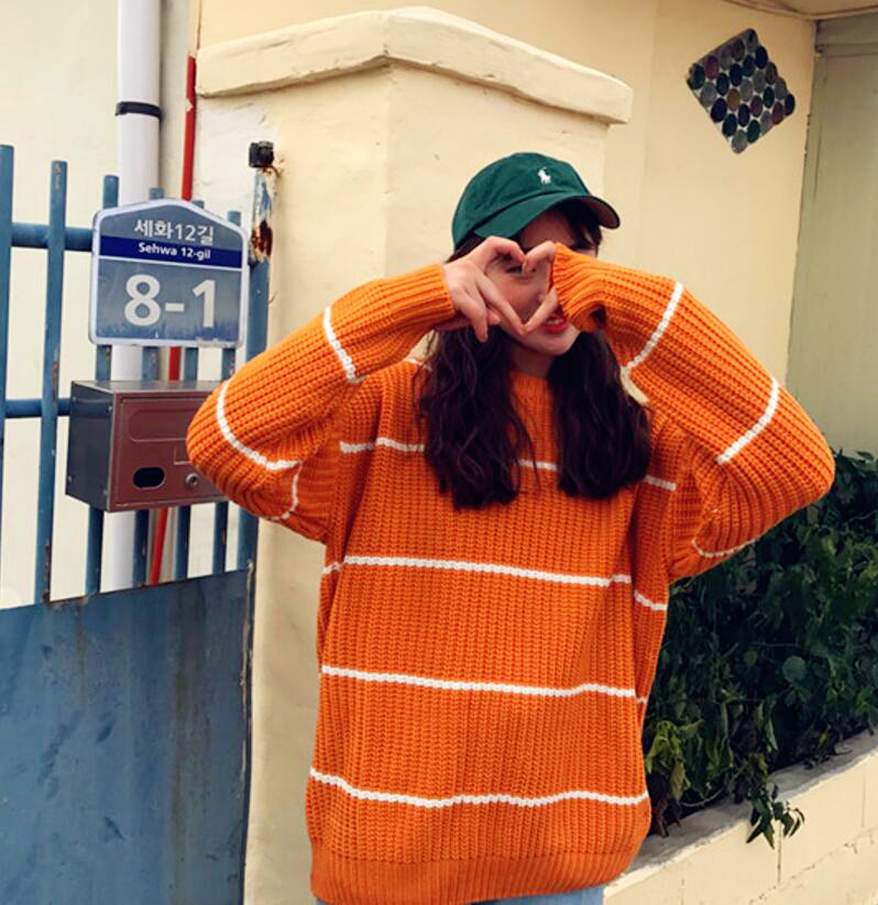 Casual & Harajuku O-neck orange striped jumper knit sweater.