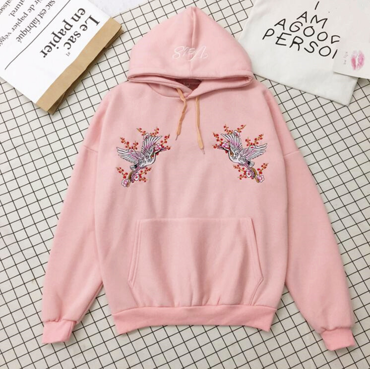 Boyfriend style & Harajuku crane flower embroidered fleece hoodie sweatshirt.