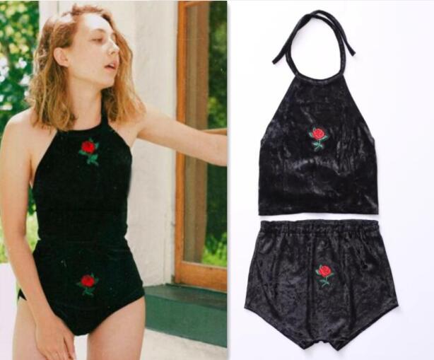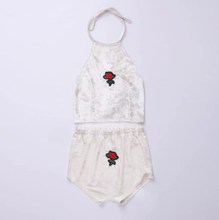 Sexy Rose Embroidery Velvet Crop Top + Shorts Set