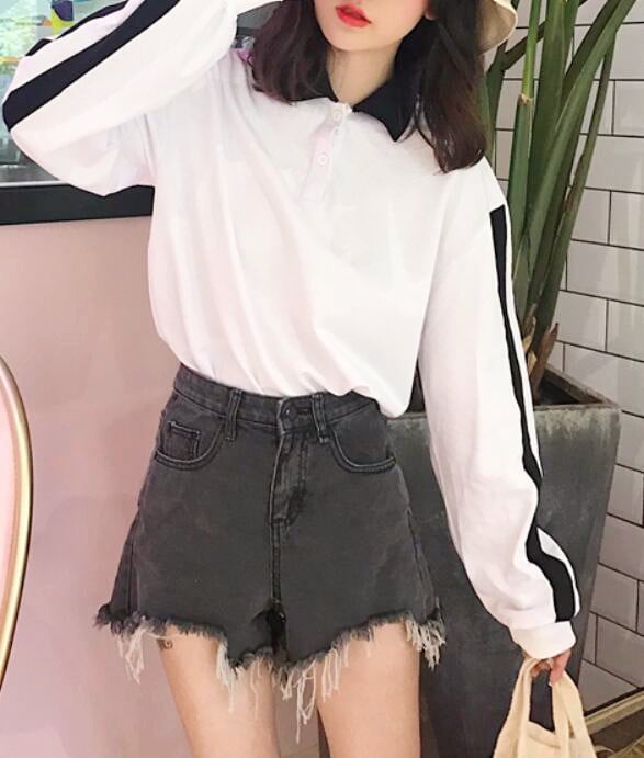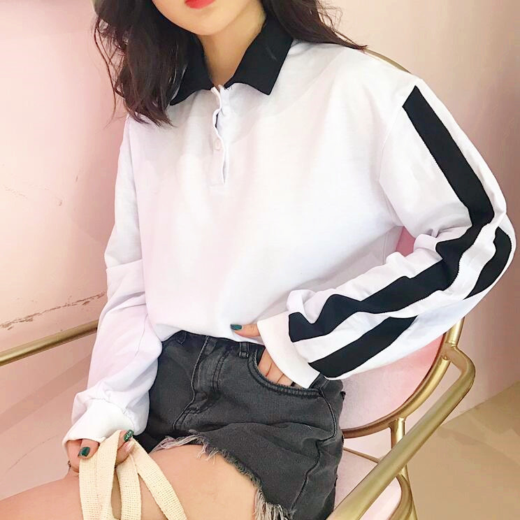 Harajuku & Fashion striped turn-down collar long sleeved polo T-shirt.