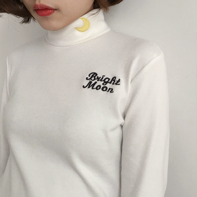 Fashion & Ulzzang Bright Moon embroidered turtleneck long sleeve T-shirt.