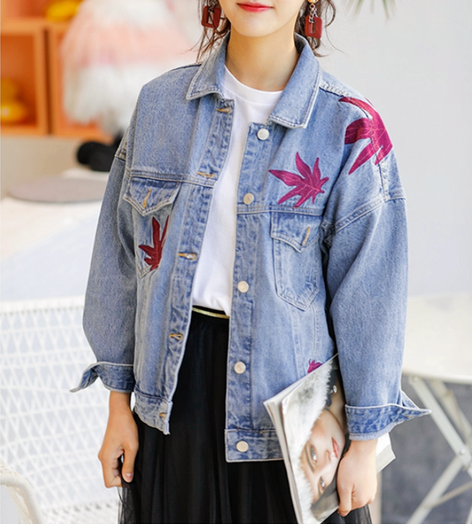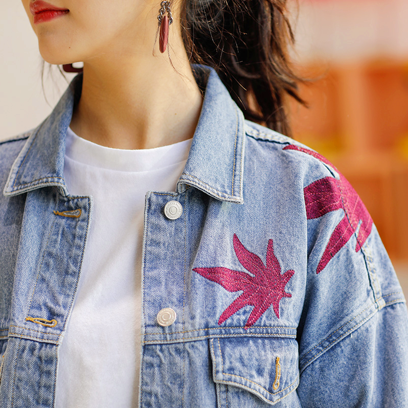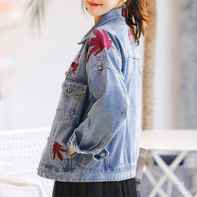 Fashion & Harajuku maple leaf embroidery denim jacket.