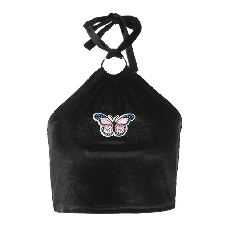 Butterfly Embroidery Velvet Lace up Halter Neck Top