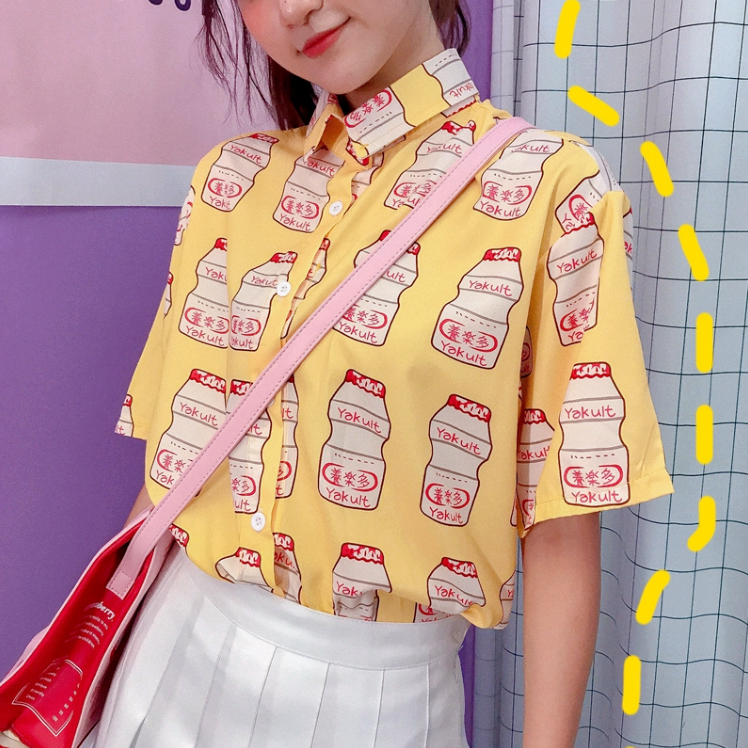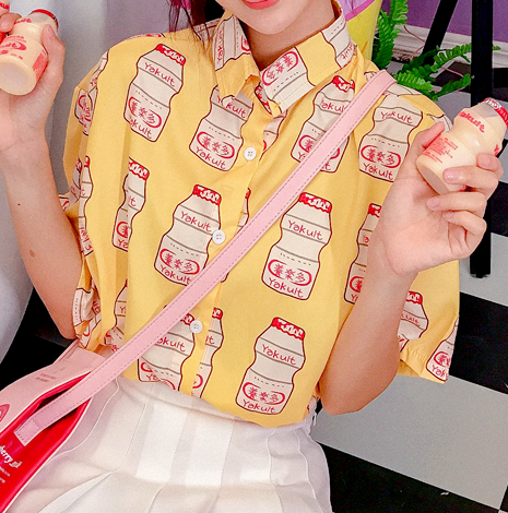 Free Shipping Yakult Bottle Printed Yellow Blouse