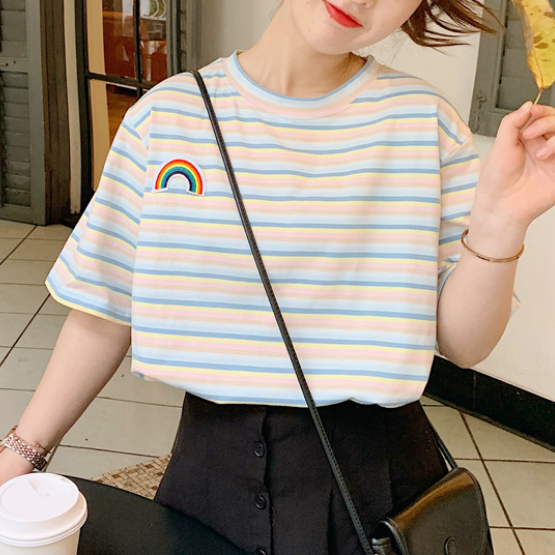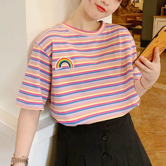 Harajuku & Kawaii rainbow embroidered color block stripe tee.