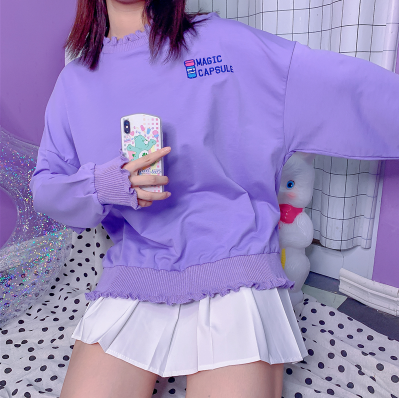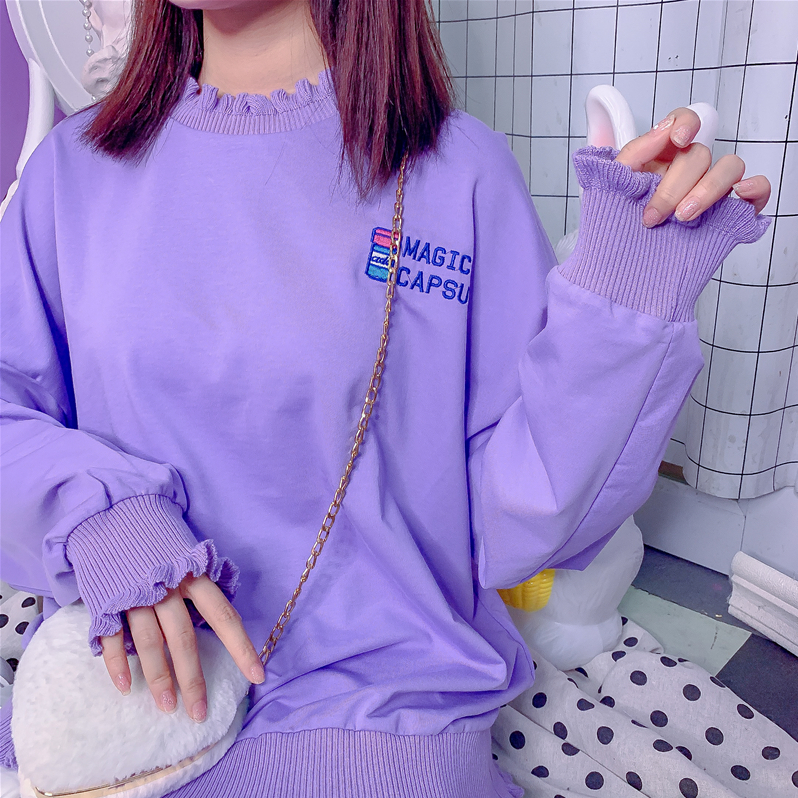 Fashion & Harajuku MAGIC embroidery flounced purple sweatshirt.