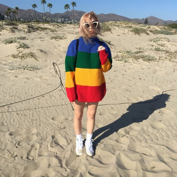 Fashion & Harajuku rainbow stripe color block knitted jumper sweater.