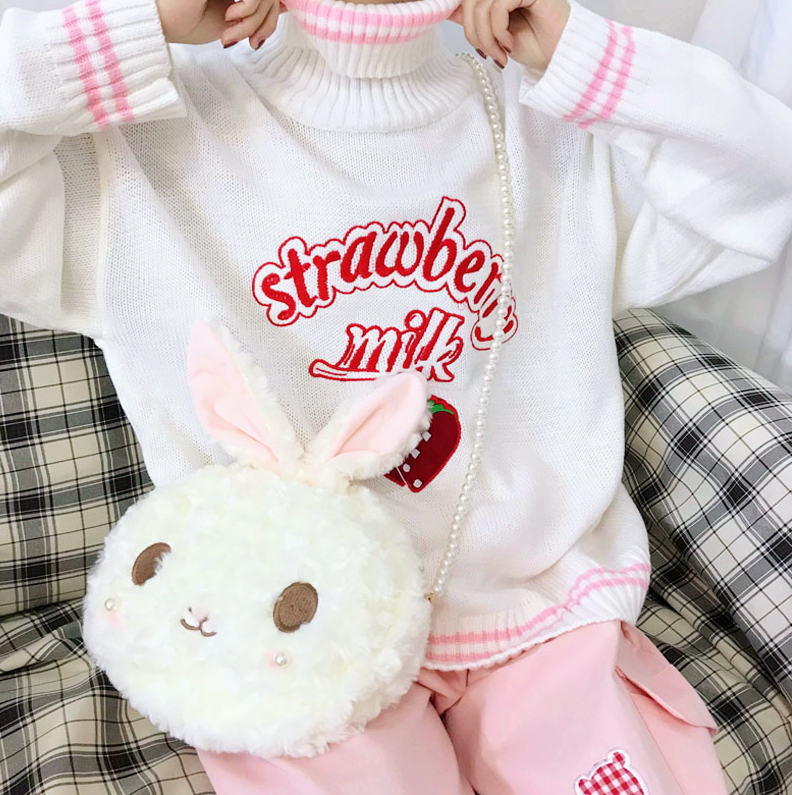 Harajuku & Cute strawberry milk embroidery turtle neck pink / white sweater.