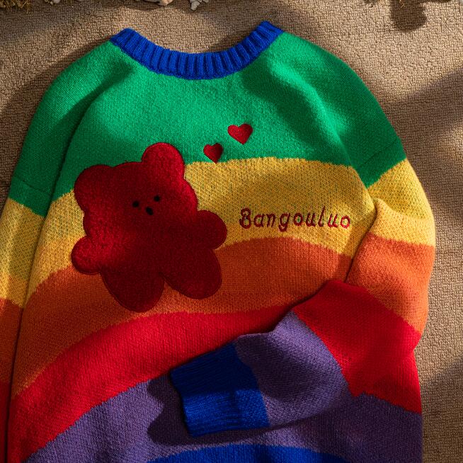 Cute & Fashion bear embroidery rainbow jumper sweater.