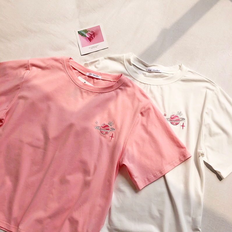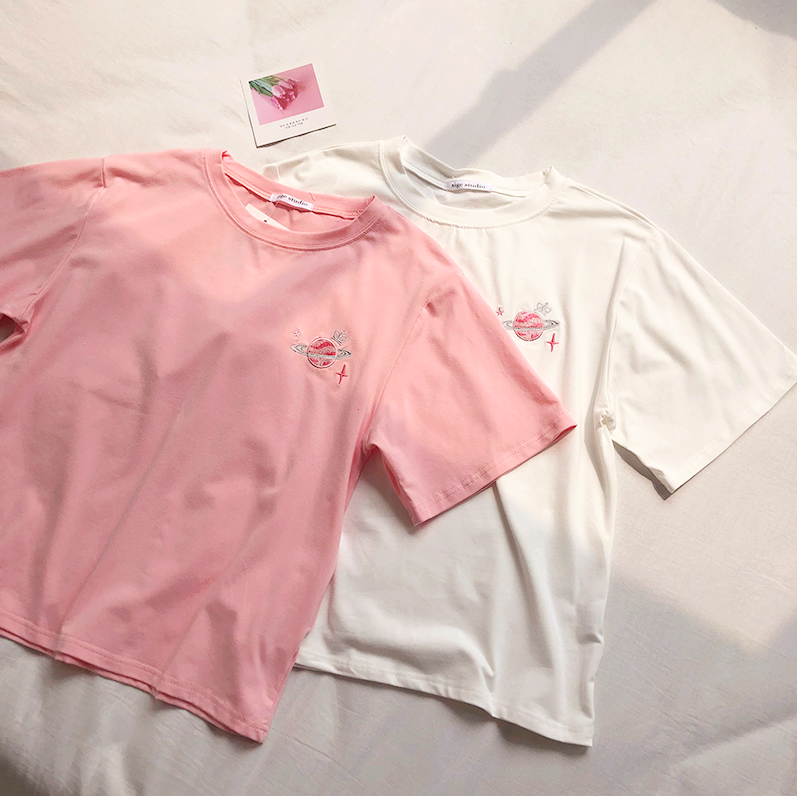 Cute & Harajuku planet crown embroidery short sleeve T-shirt.