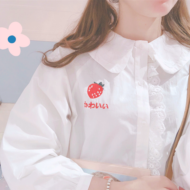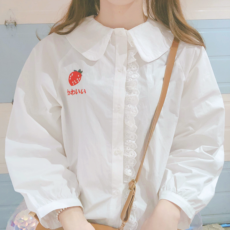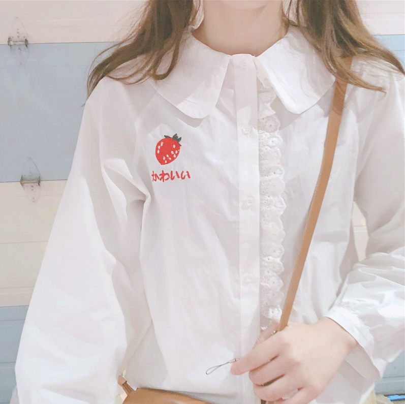 Sweet strawberry embroidery lace long sleeve blouse women shirt.