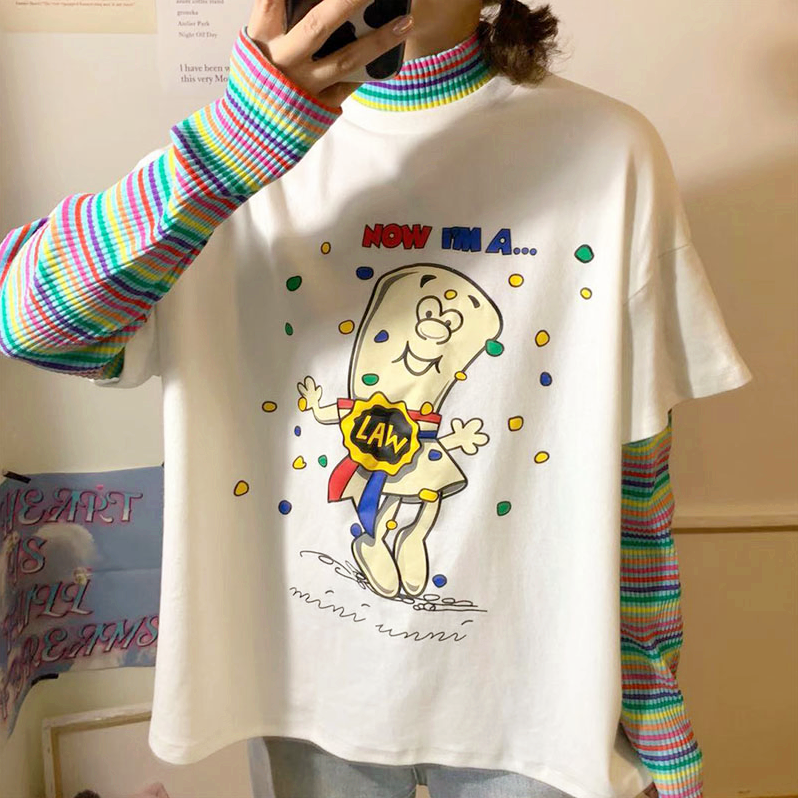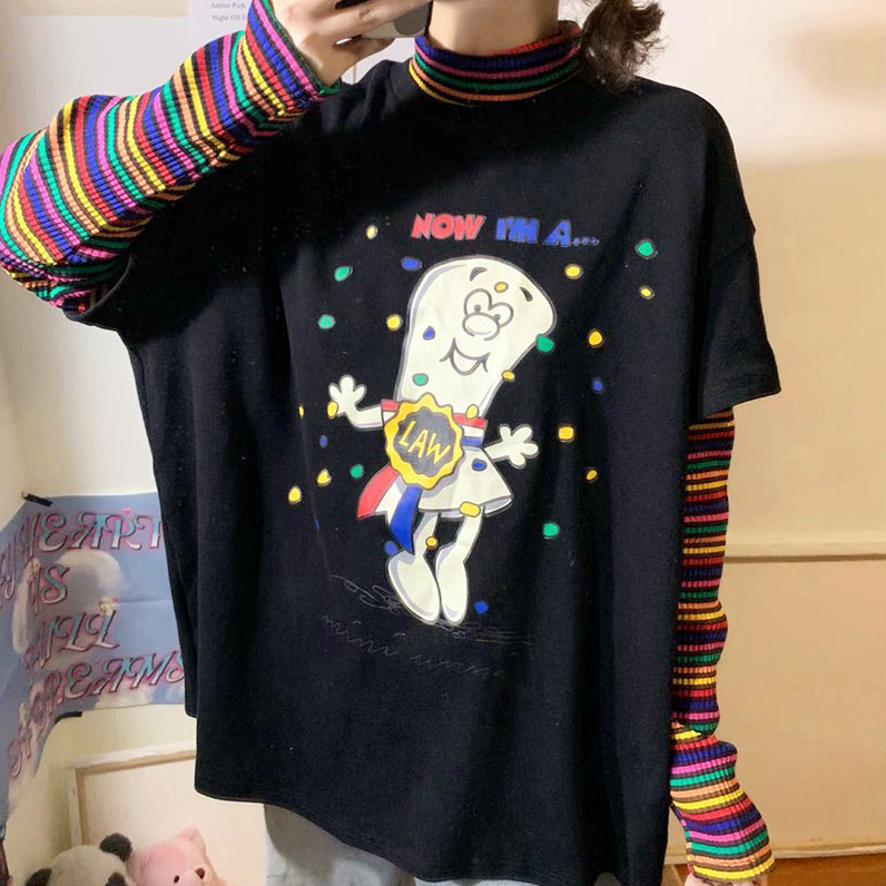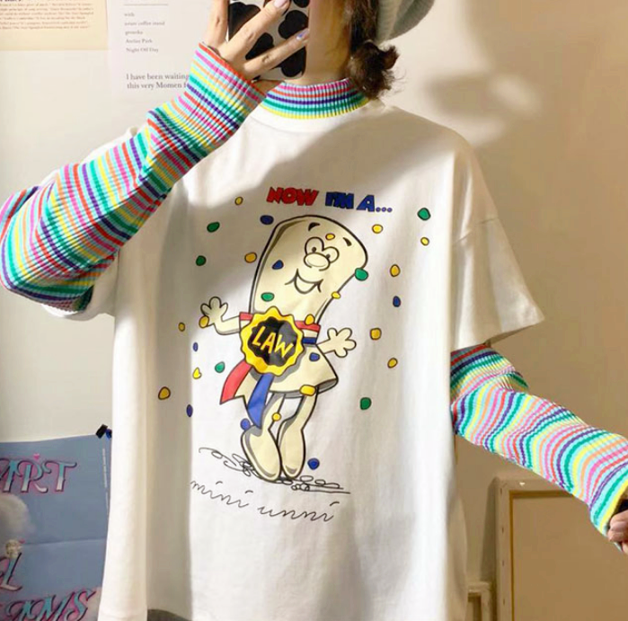 Cute & Harajuku cartoon printed rainbow stripe neck long sleeve layered T-shirt.