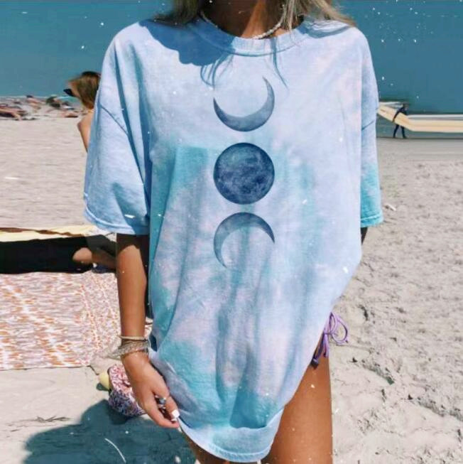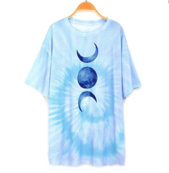 Harajuku & Sweet cresent moon printed pastel blue tie dye tee.
