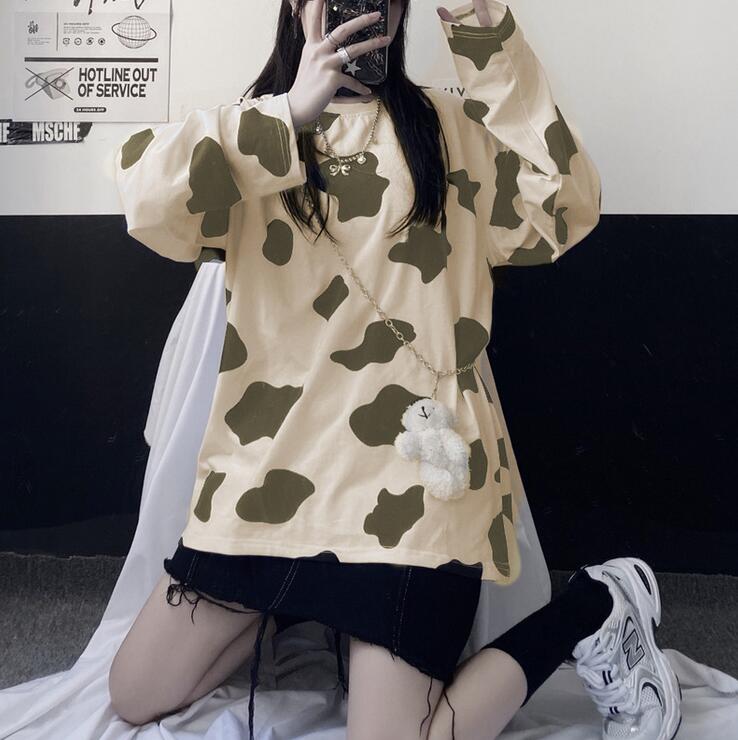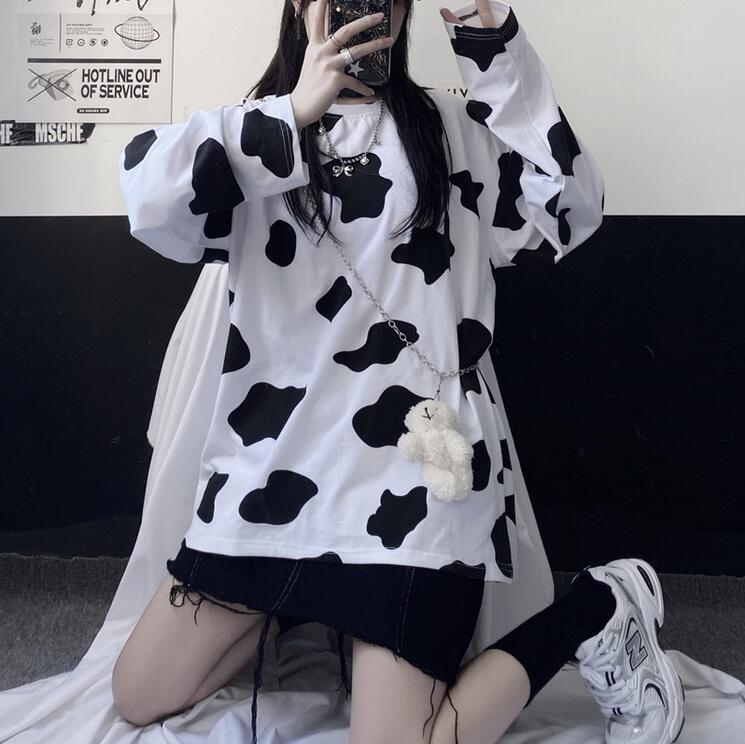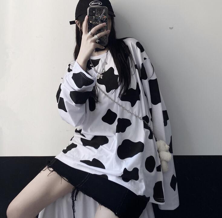 Fashion & Harajuku cow printed oversized long sleeve t-shirt.