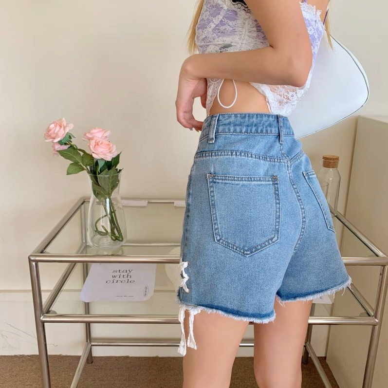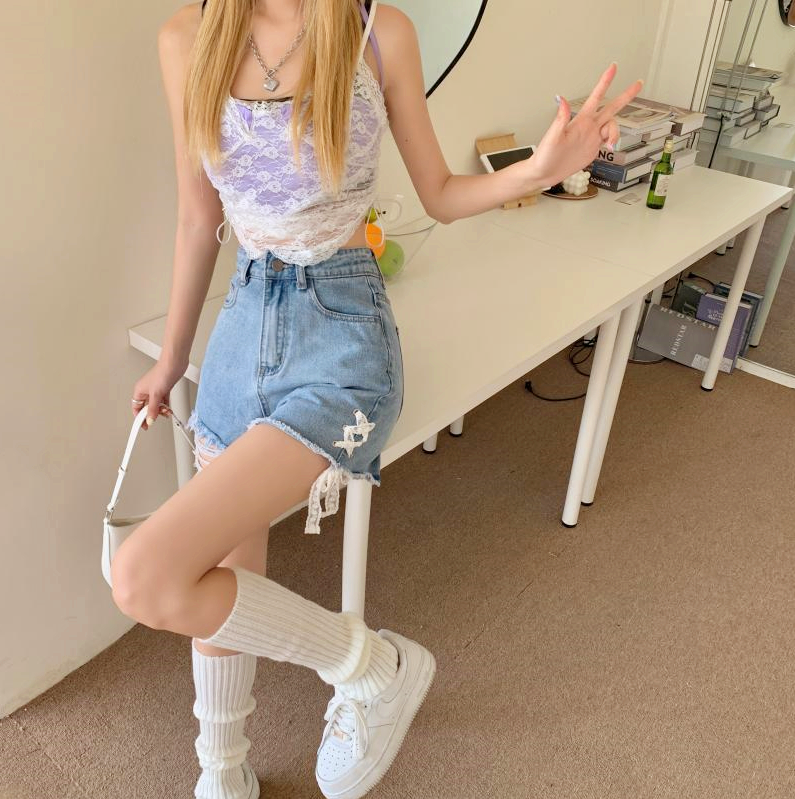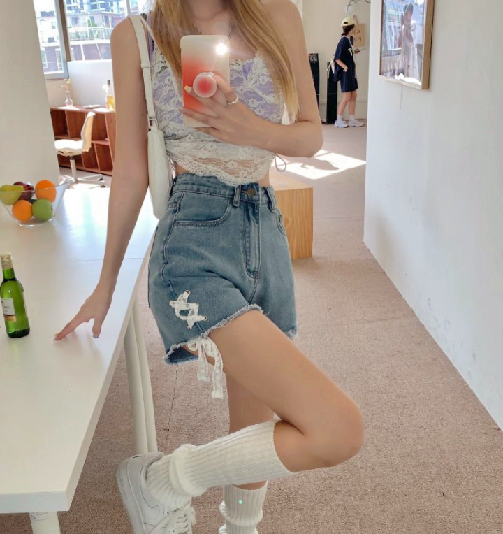 Fashion & Chic high waist lace cross ripped denim shorts.