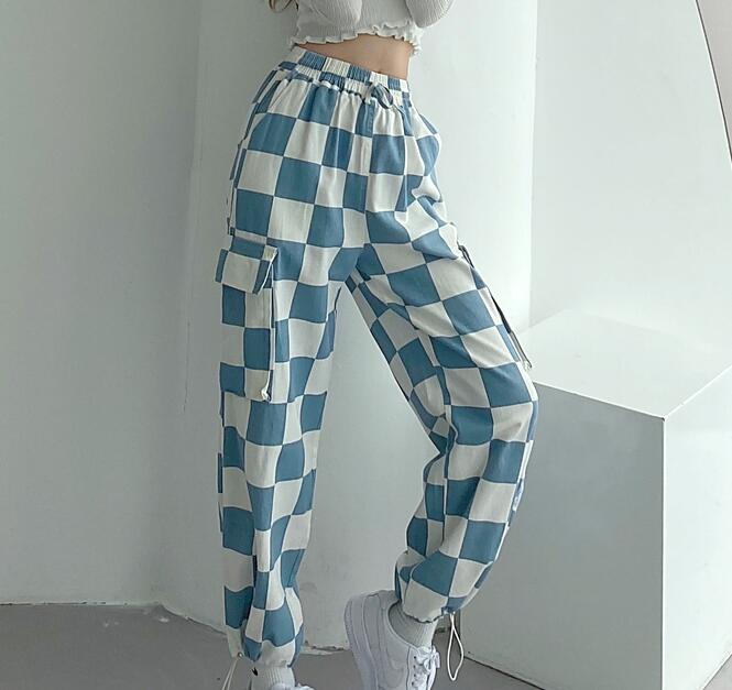 Fashion & Harajuku blue white color block checker casual pants, joggers.
