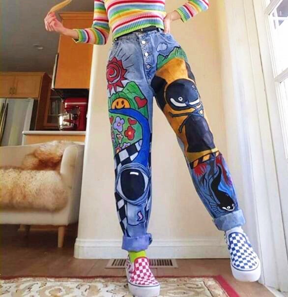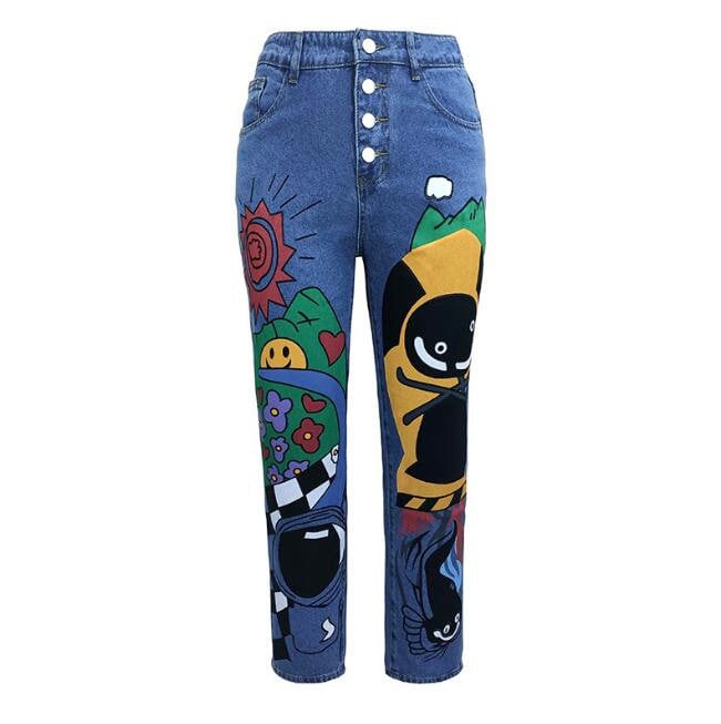 Harajuku & Fashion colorful cartoon alien printed jeans denim pants trousers.