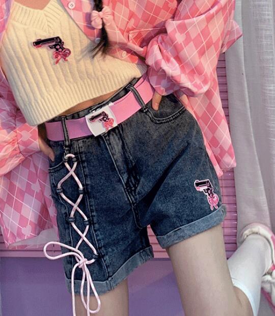 Harajuku & Cute embroidery cross lace up jeans denim shorts.