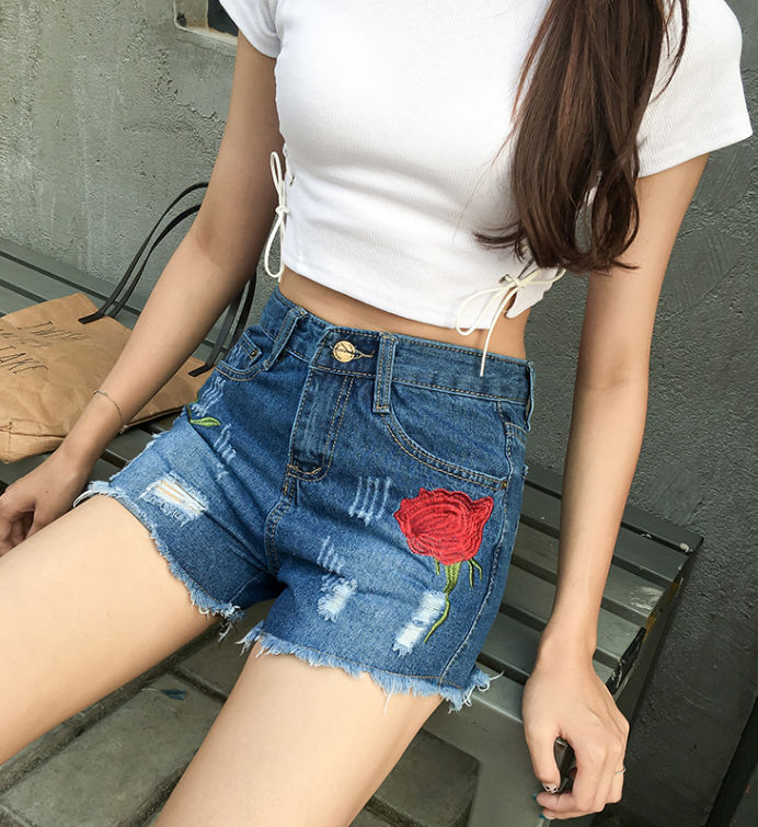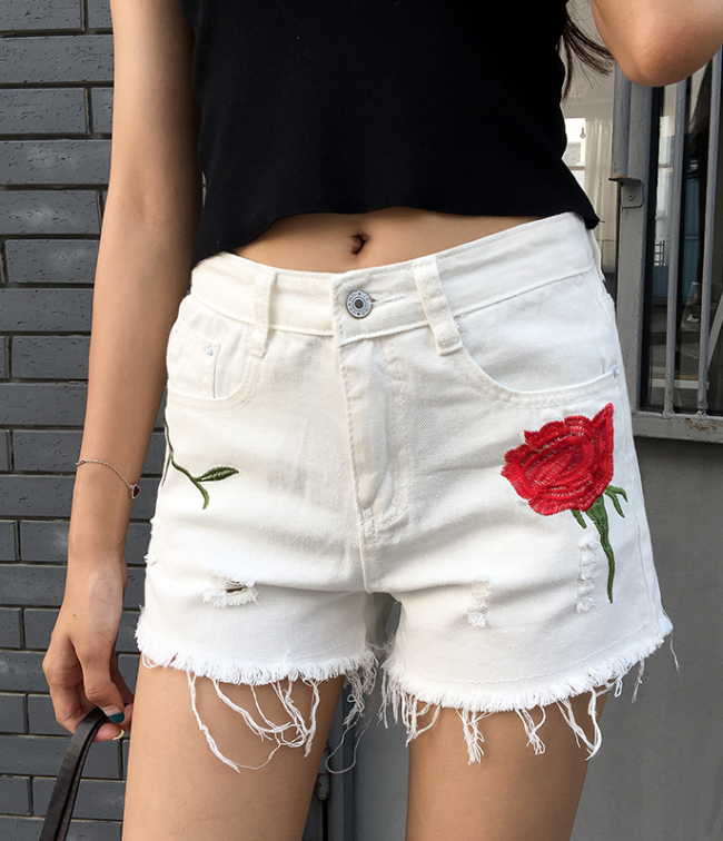 Fashion & Harajuku rose embroidered ripped denim shorts.