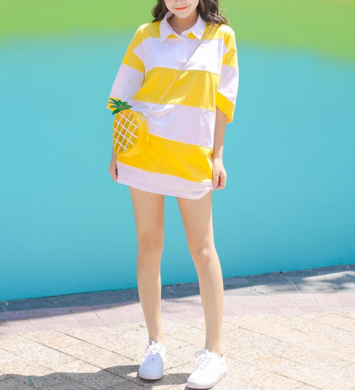 Fashion & Harajuku yellow white stripe turn-down collar oversize T-shirt dress.