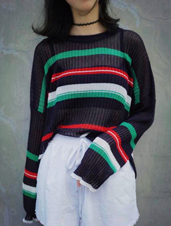 Retro & Harajuku see-through striped knitted sweater .