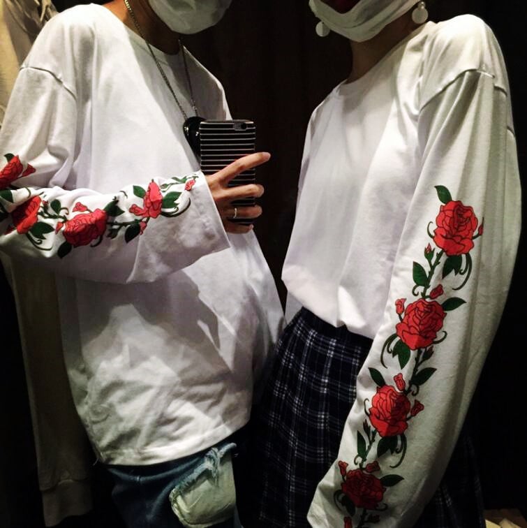 Vintage & Harajuku rose printed long sleeve T-shirt.