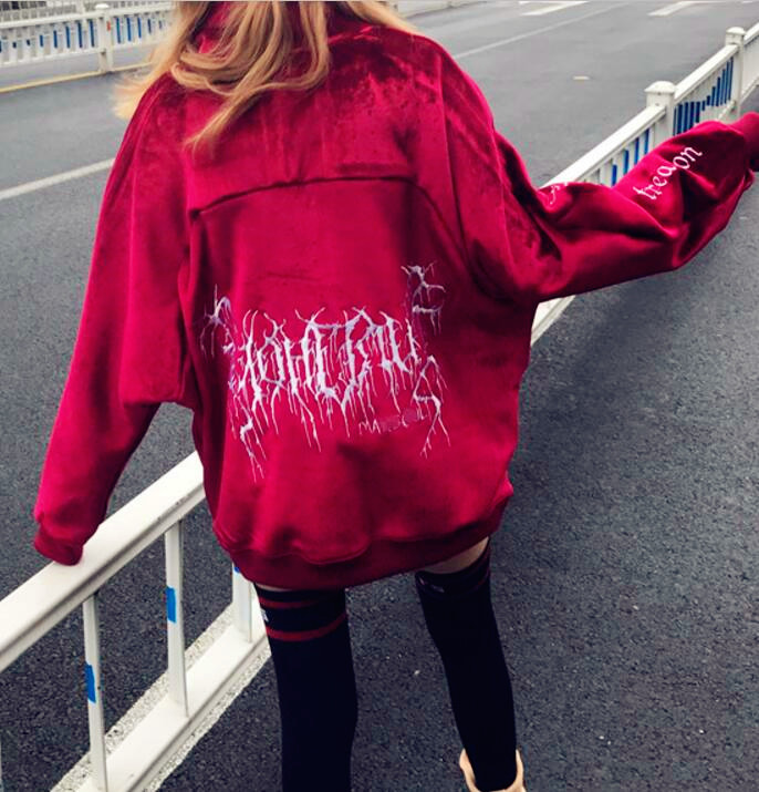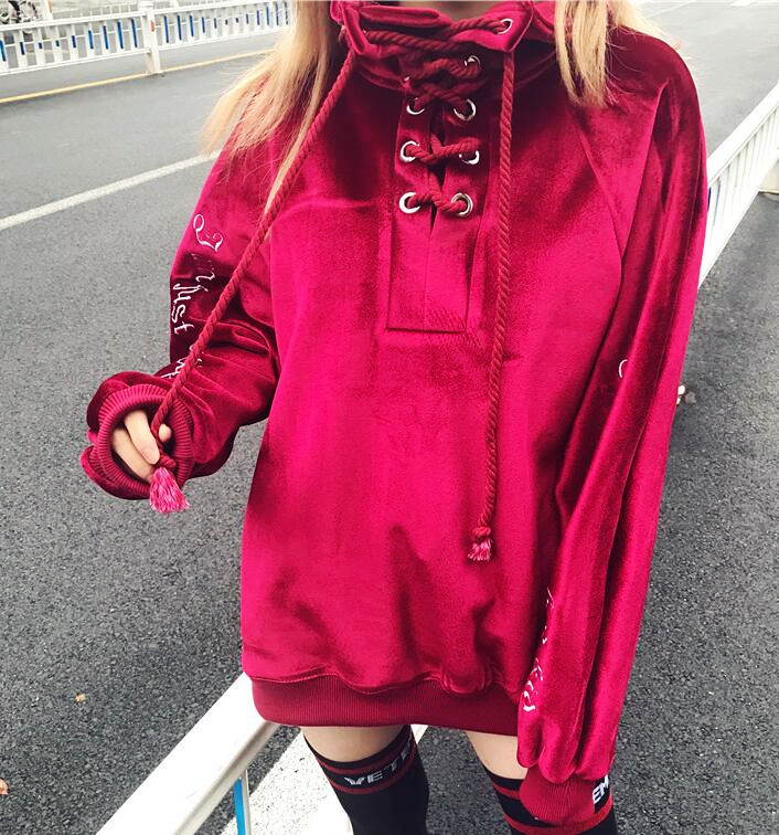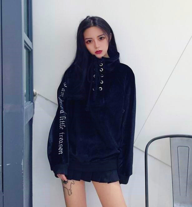 Fashion & Harajuku high neck lace up embroidered velvet sweatshirt.