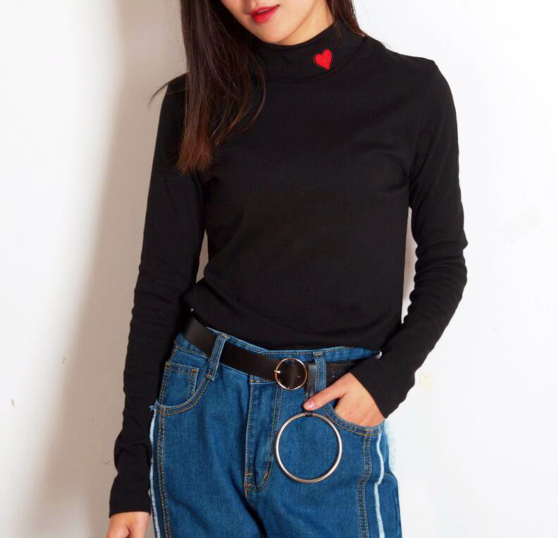 Harajuku red heart embroidered high neck long sleeved T-shirt.