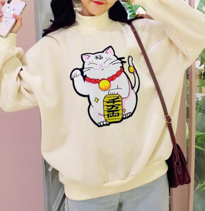 Kawaii & Harajuku Fortune cat/lucky cat embroidered high neck sweatshirt.