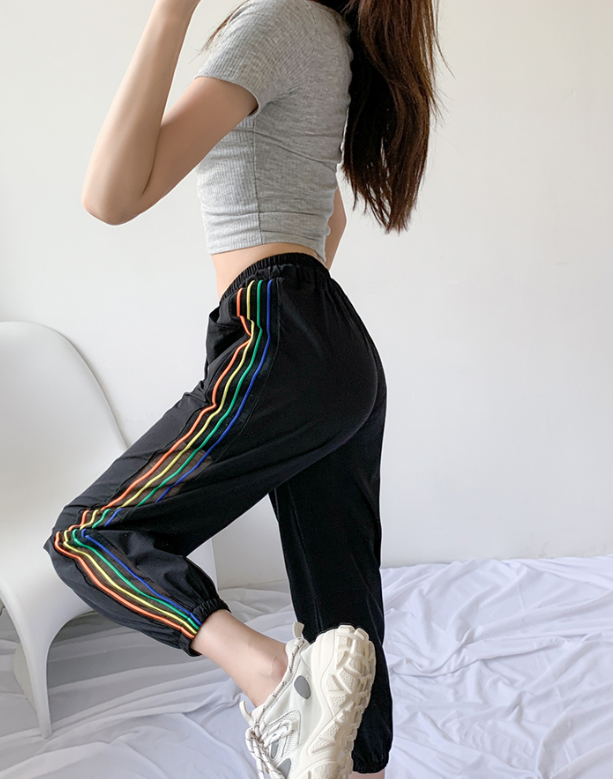 Fashion & Harajuku side rainbow stripe shiny casual pants.