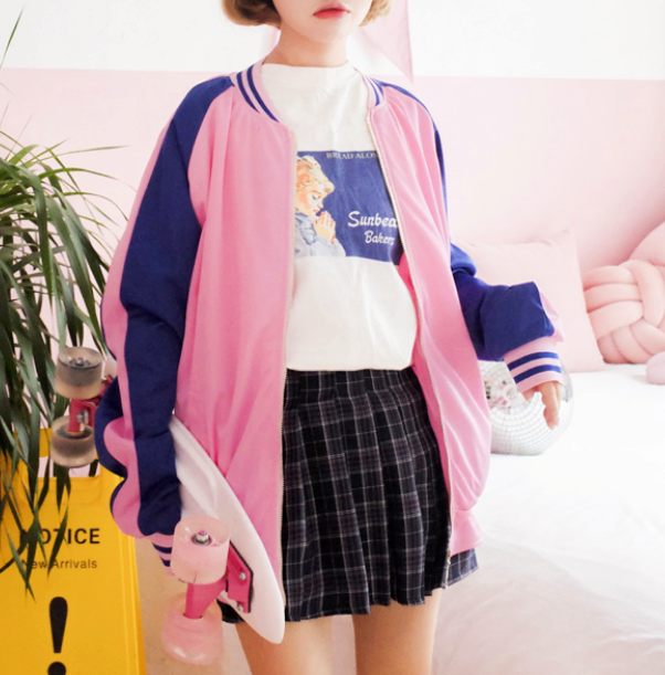 Fashion & Harajuku pink and blue color block sports windbreaker baseball jacket.