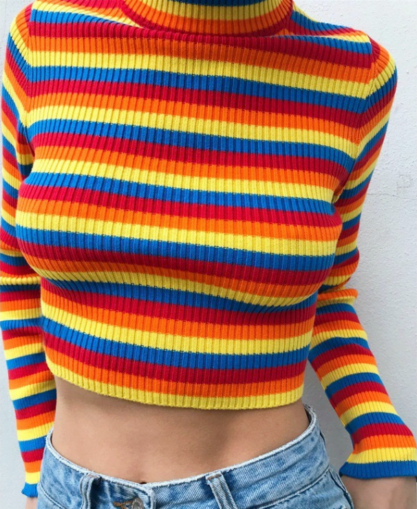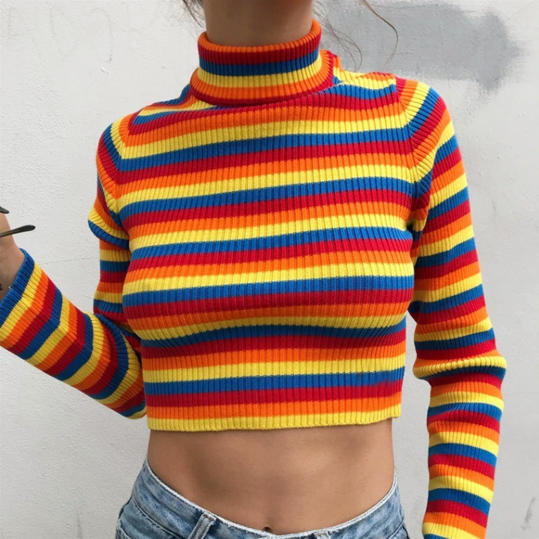 Fashion & Harajuku rainbow stripe long sleeve knit top.