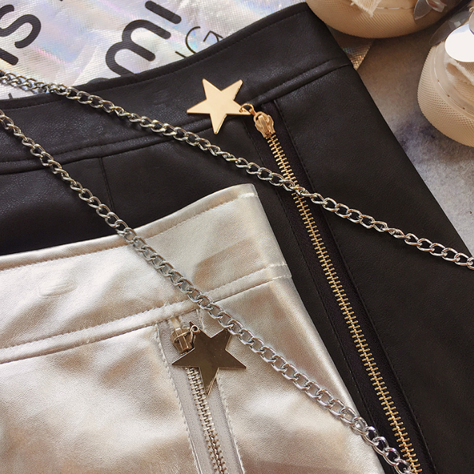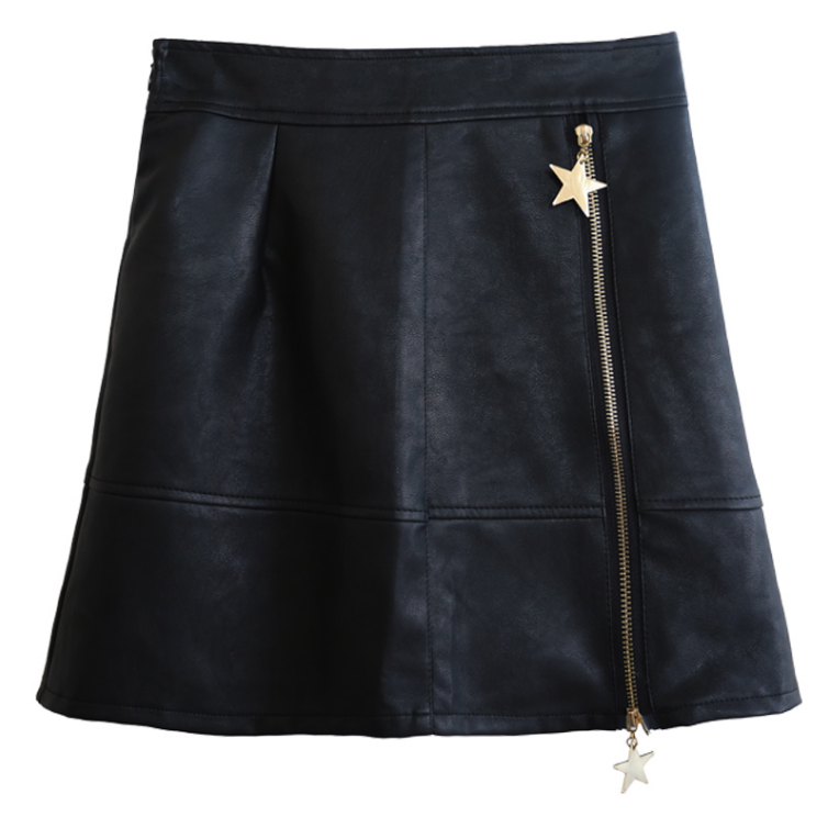 Fashion & Chic high waist star zip PU Leather A-line skirt.