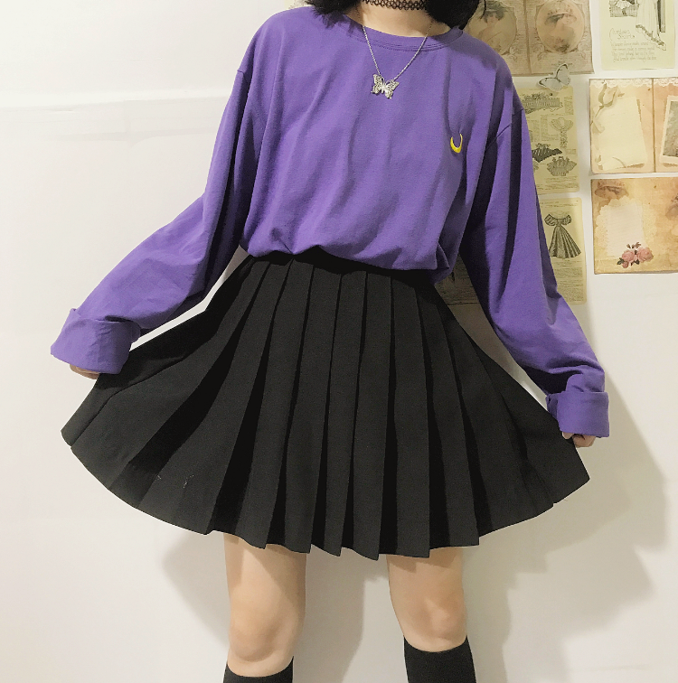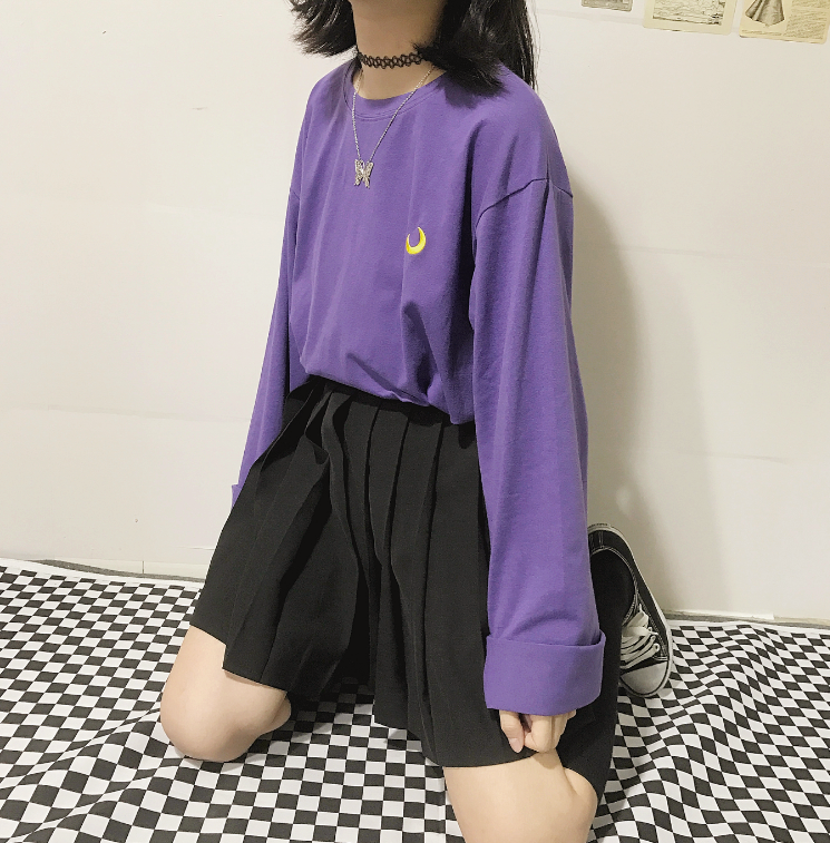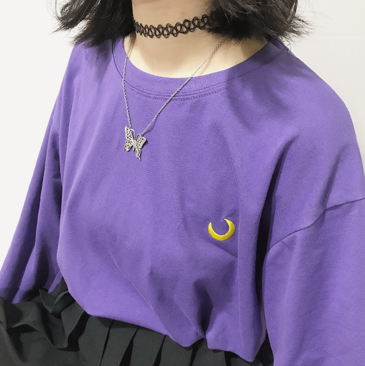 Fashion & Harajuku moon embroidery prupel long sleevedT-shirt.