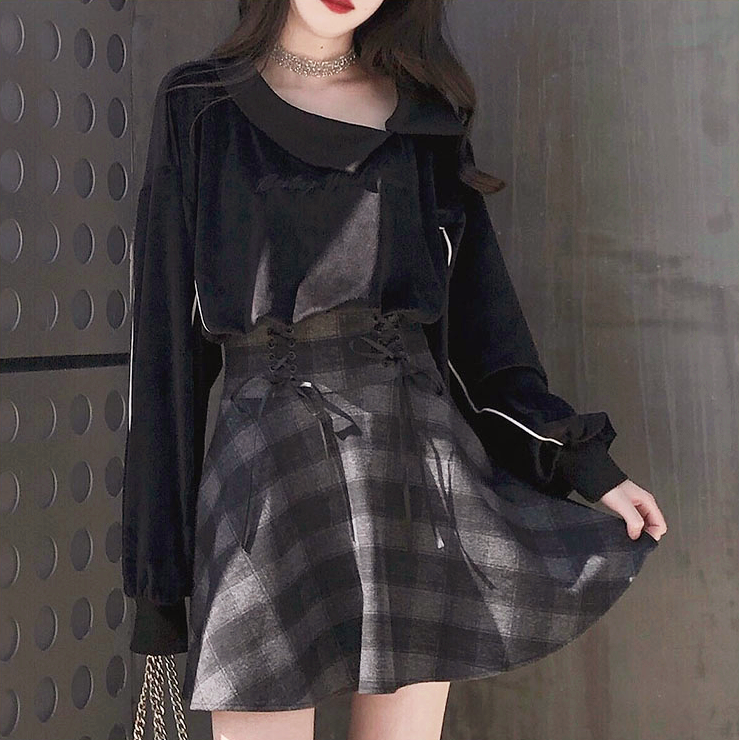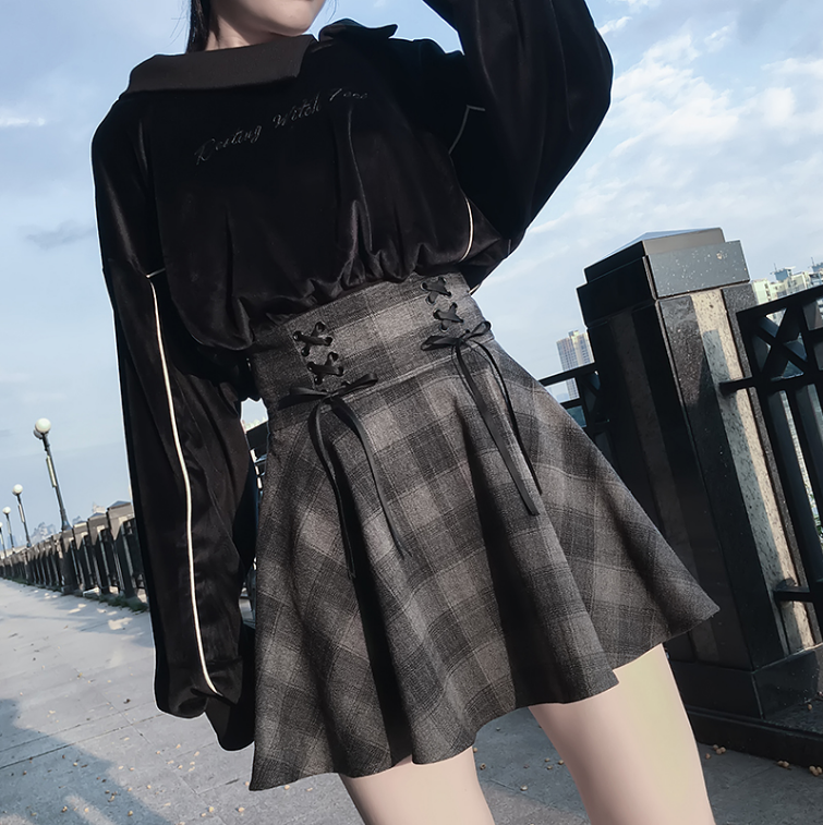 Fashion & Chic high waist lace up checker woolen A-line skirt.