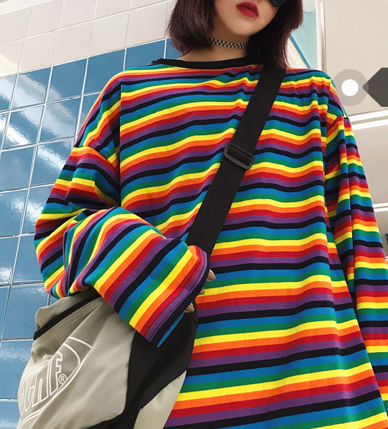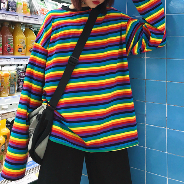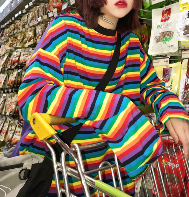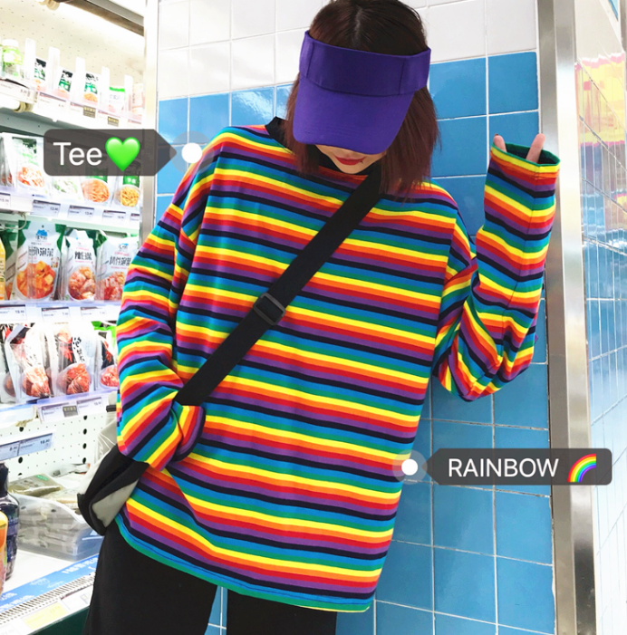 Fashion & Harajuku rainbow stripe long sleeve T-shirt.