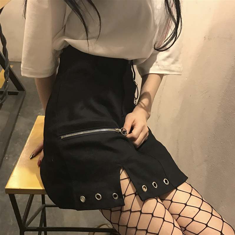 Fashion & Chic round ring chain high waist plaid zip up skirt.