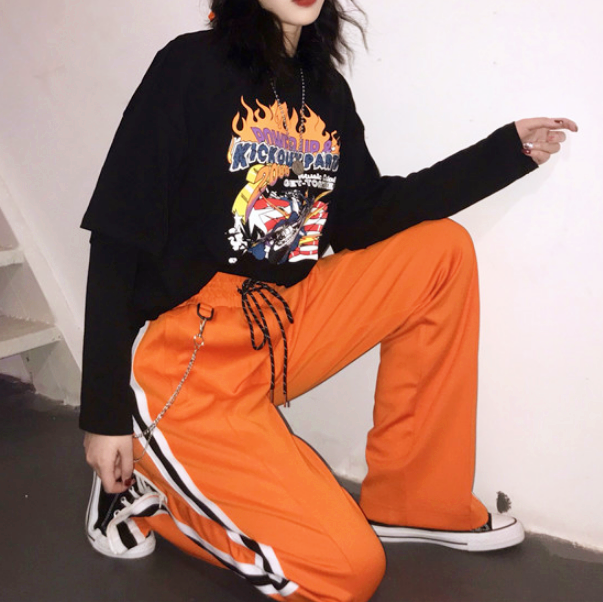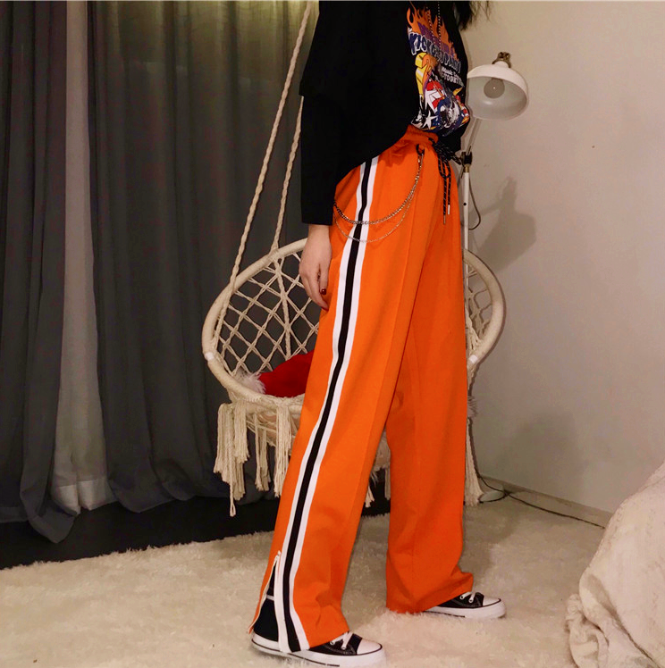 Fashion & Harajuku black orange stripe color block side slit pants with zipper.