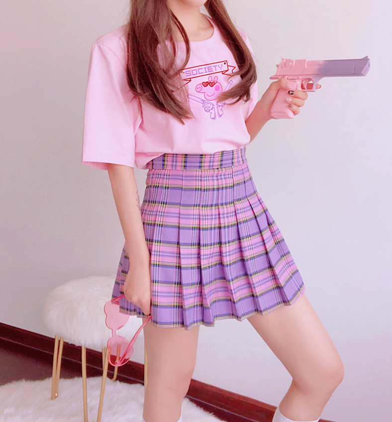 JK Fashion Uniform Pastel Purple Pink Checker Plaid Pleated Skirt