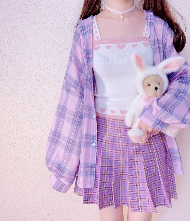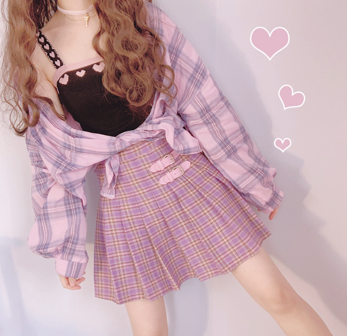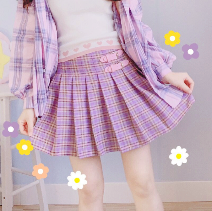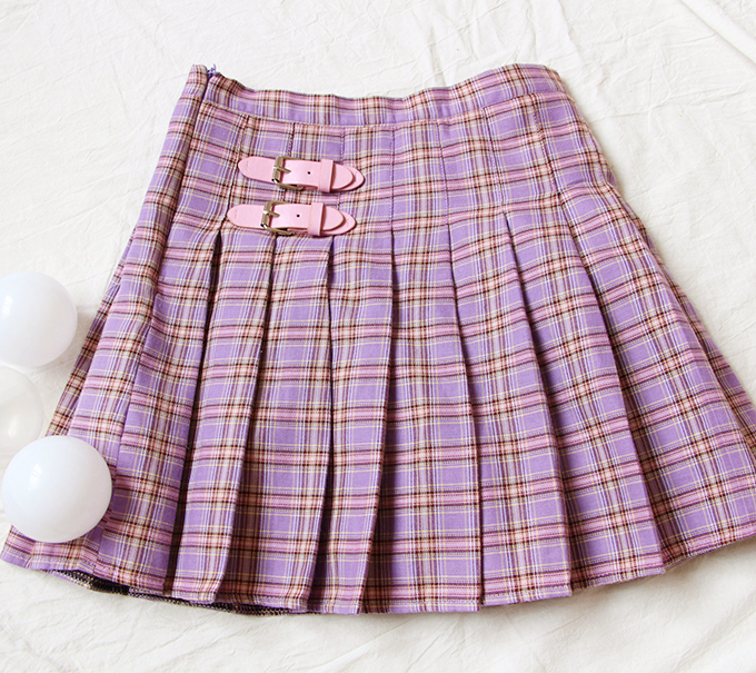 Sweet & Harajuku pastel pink belt purple checker plaid pleated skirt.