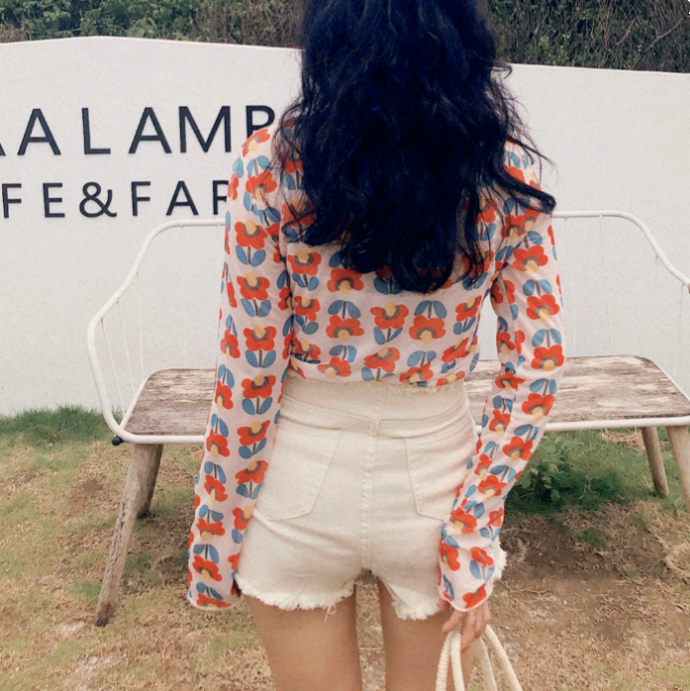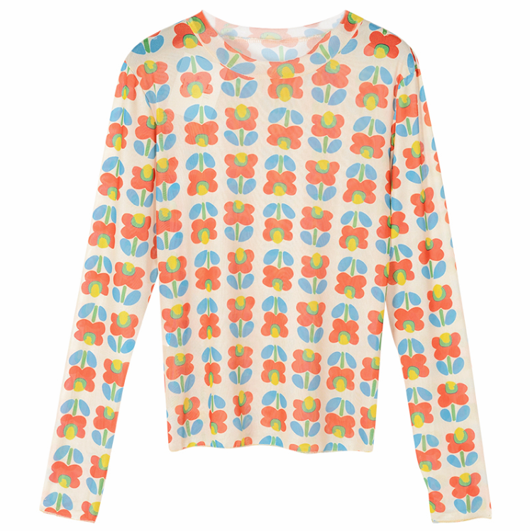 Chic & Fashion see-through flower printed long sleeve gauze mesh top.