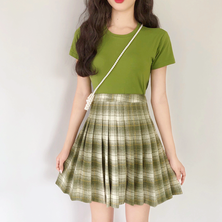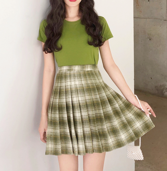 Harajuku high waist green checks plaid pleated A-line skirt.