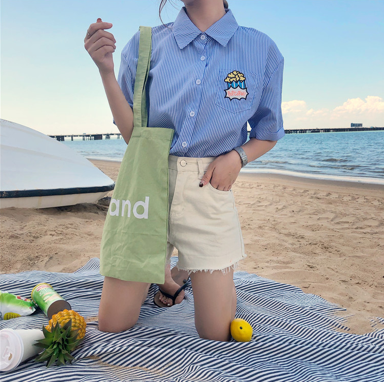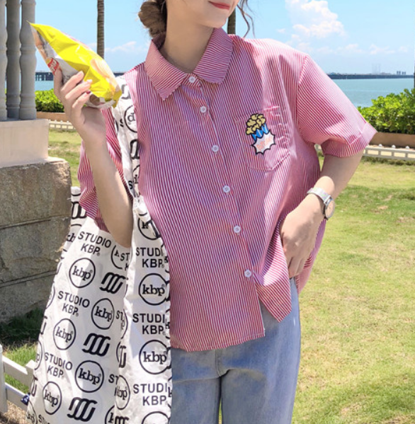 Harajuku & Cute MOVIE TIME printed stripe blouse polo shirt.
