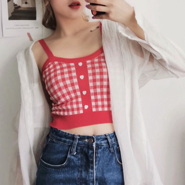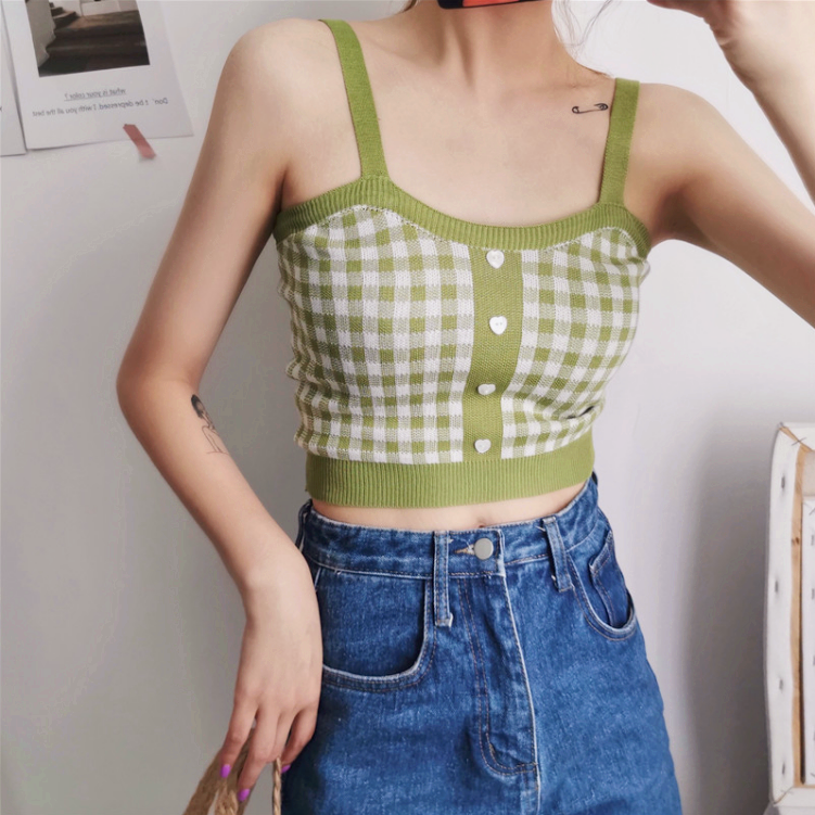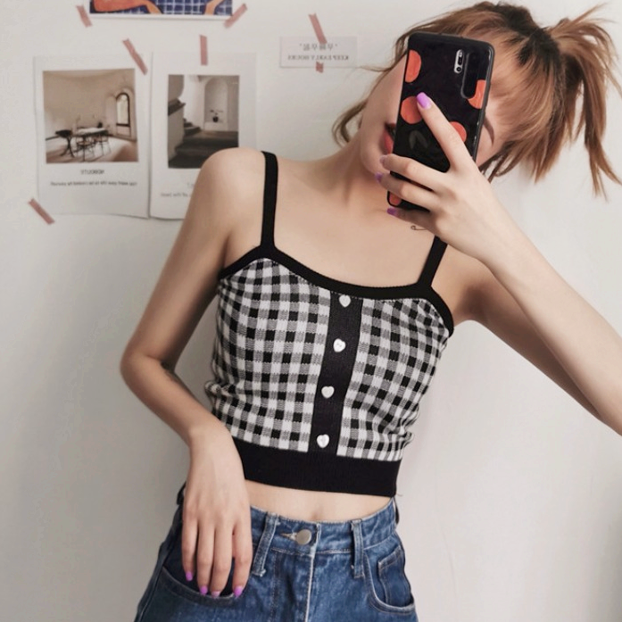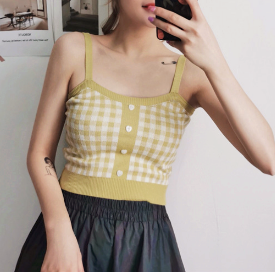 Fashion color block plaid checks knitted vest crop top.